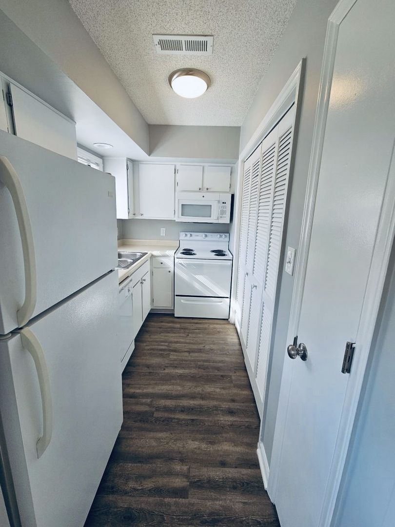 This apartment home is located in a single-story building and features a charming kitchen with a window above the sink overlooking the landscaping. A private patio and additional storage room are located off the back of the living room. Large closets and en-suite bathrooms in both bedrooms are an added convenience.